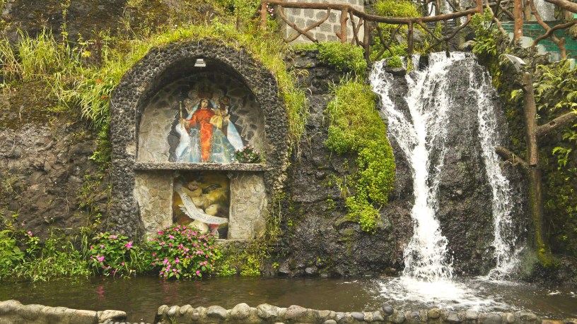We took a brief look into Nuestra Señora del Rosario de Agua Santa Church. The altar is lovely, but it’s really the murals, both depicting local miracles attributed to the Virgin Agua Santa, and some more typical biblical scenes, that impress. Next to the Piscinas de la Virgen, the Agua Santa Waterfall also has pools where people come to drink the water, believing that the virgin will heal them and perform miracles.