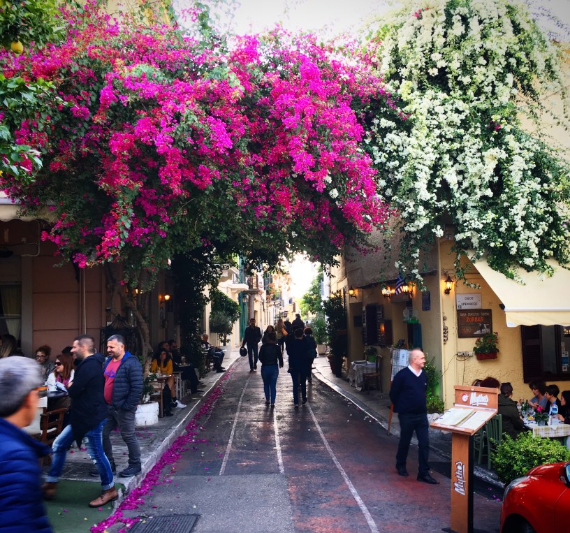 We had all day Saturday to enjoy the pleasant November weather in Athens. Since I’ve been to Athens before, and my friend is a native Athenian, we bypassed the ruins (which are actually very worthwhile when you have more time) and instead spent our day in the Monastiraki and Plaka neighborhoods. These are said to have the prettiest streets in Athens, and I’m inclined to agree. Monastiraki Square was buzzing with tourists, lunch-goers, balloon sellers, pigeons, children playing. We sat outside a café and ordered a salad (Greek, of course) and souvlaki.