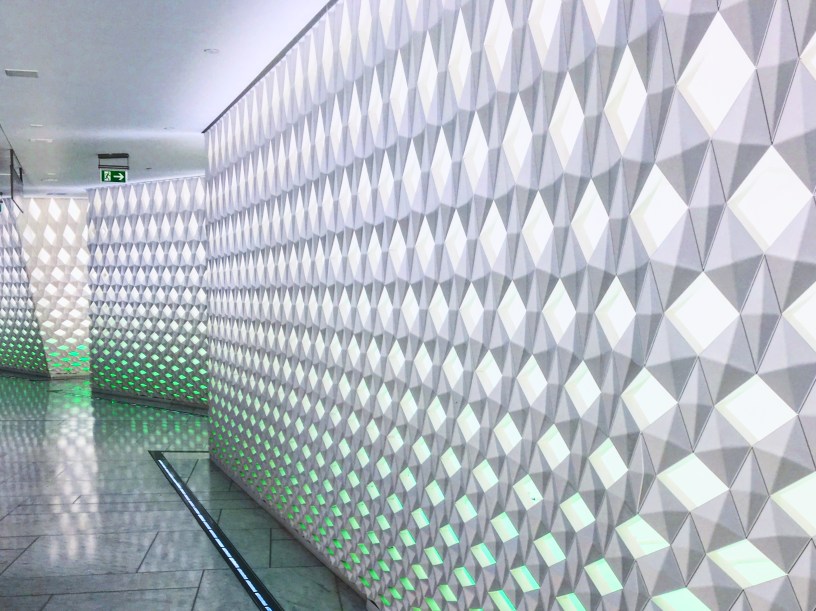 We began with a walk around the Norwegian National Opera & Ballet, which you spot from the deck of the ferry upon arrival into Oslo, is designed by Snøhetta, and really is an architectural enchantment. Walking towards the entrance, you are actually walking on the slanted roof of the building, winding your way up, with the Oslo Fjord as the backdrop. Inside, the walls light up in green and white diamonds.