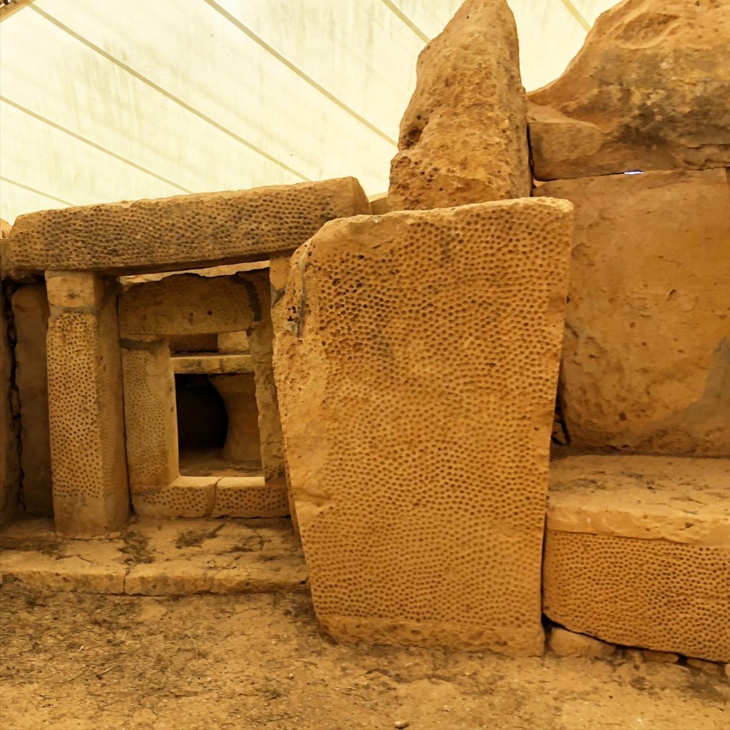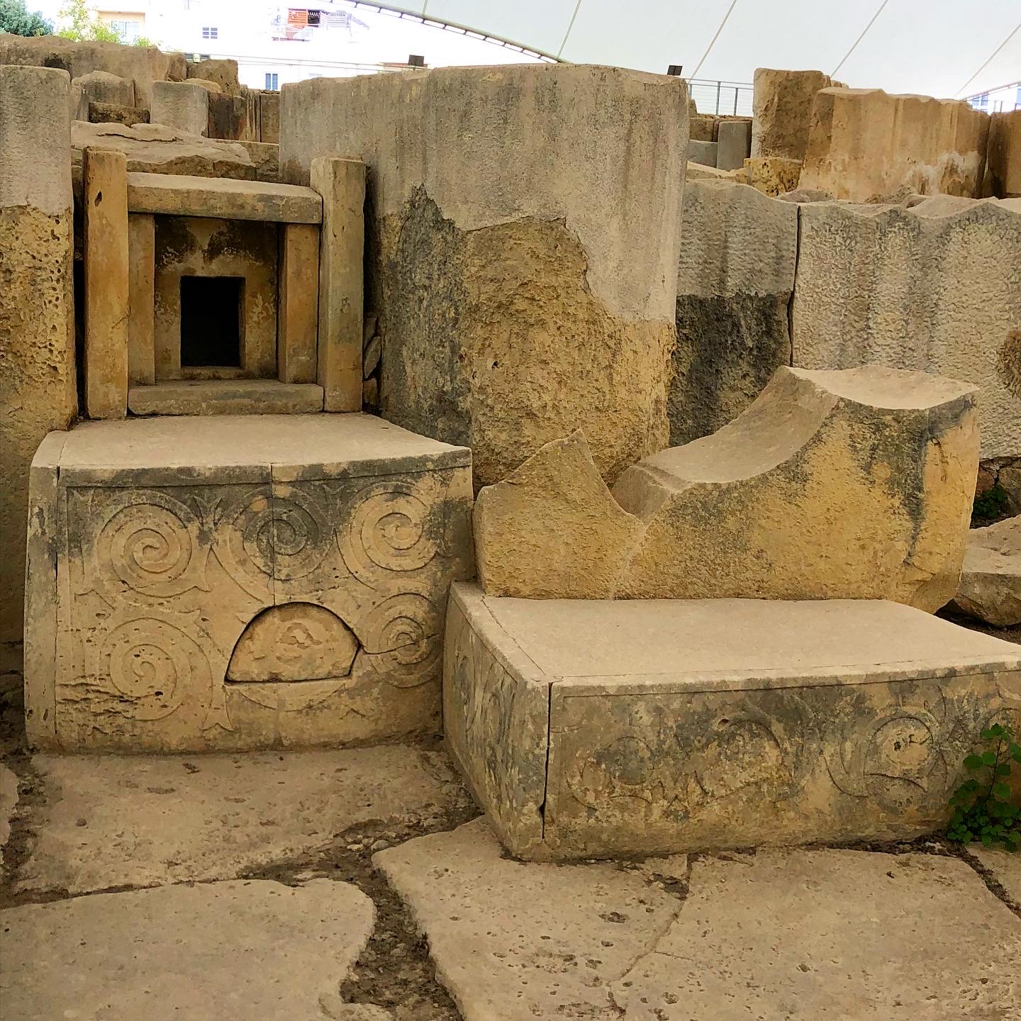 Ħagar Qim and Mnajdra Temples are megalithic temple complexes with a selection of prehistoric chambers, Ħagar Qim is believed to be a prehistoric observatory, while archaeologists suggest that Mnajdra was once used for religious ceremonies and sacrificial rites. Mnajdra is constructed of coralline limestone and decorated with spiral carvings, and both temples are semi-enclosed with large tents to protect them.