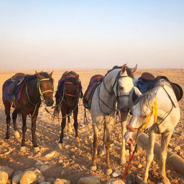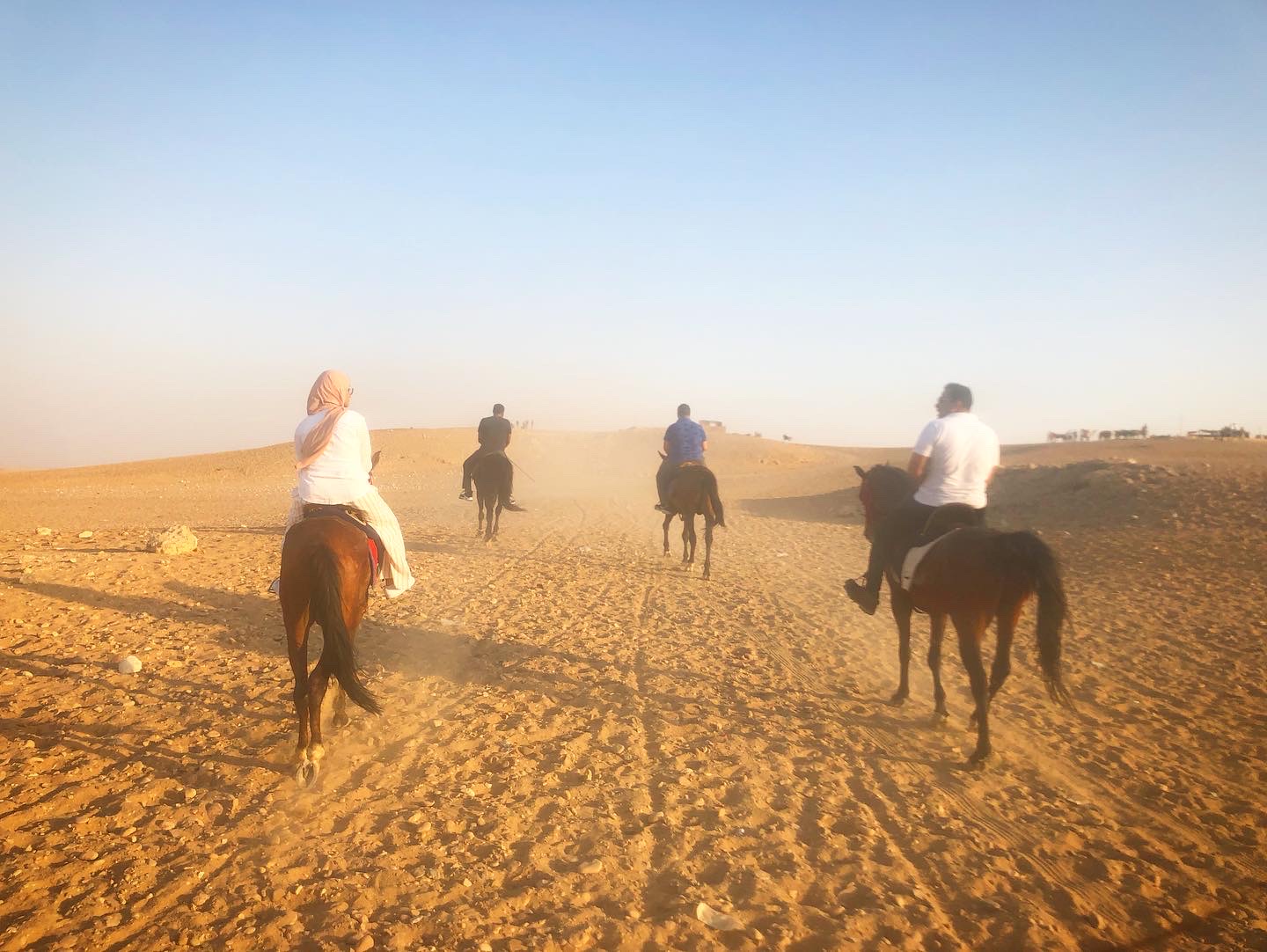 The horse back riding trip started at Safins Horses where we first relaxed a bit, had a cold drink, chatted, and watched horses, carriages, and camels meandering past us. We were waiting for the sunset, so we’d have great views and a little less intense heat. Then we met the horses, mostly rescues, all calm and tacked up ready for some exercise. Starting off, I was nervous, it’s been a few years since I’ve ridden, and I’m rusty. Luckily I have a good 5 years of lessons lodged deep in the back of my mind somewhere, and that gave me more confidence going in.