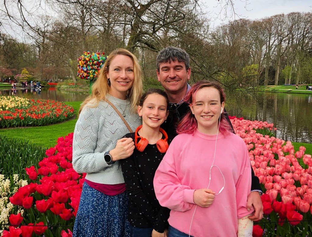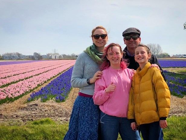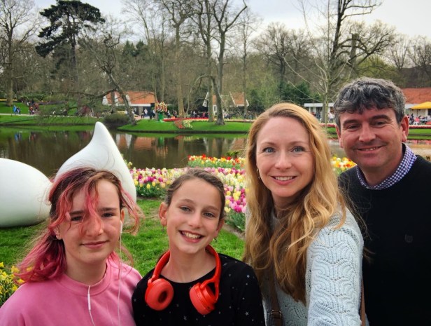 Although biking from Leiden to the fields sounded like great fun for Rudy and me, I would have heard no end of complaints from the girls, who, as they’re growing up in Denmark, see biking as a commuter activity rather than a fun and relaxing day. Thus we split the difference – took the bus to Keukenhof, rented bikes in the parking area just in front of the gardens, biked the fields for a leisurely 3 hours, and then finished up with something to eat and a tour of Keukenhof. By the end of the day we were exhausted but had really seen the best of the tulips. And the girls really enjoyed the day – I had my doubts as kids don’t generally care about flowers, but the daffodil, hyacinth, and tulip fields we saw (and smelled) really won them over.