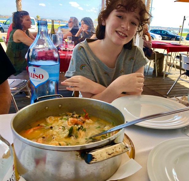Sparkling water, seafood stew, and my cutie pie