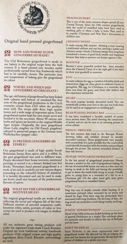 Another interesting fact – gingerbread making is a huge, and historical, deal in Český Krumlov. The first recorded documentation is from 1617 and remained central until WWI, when industrial gingerbread production and an increasing interest in other kinds of confectionery made the practice more or less obsolete.
