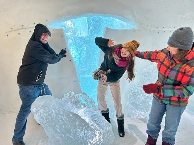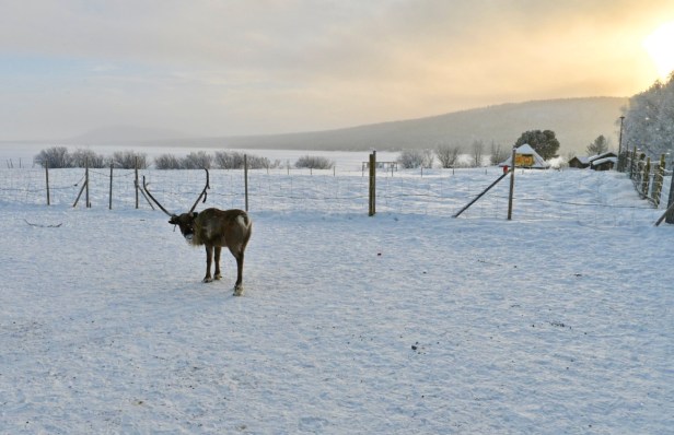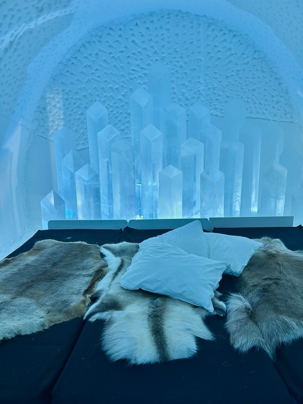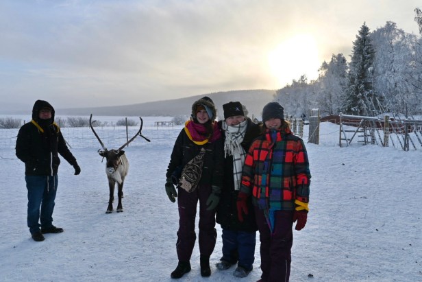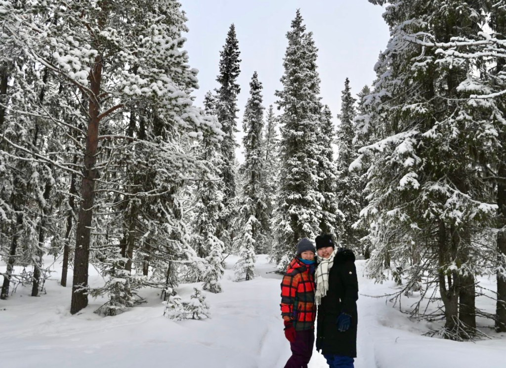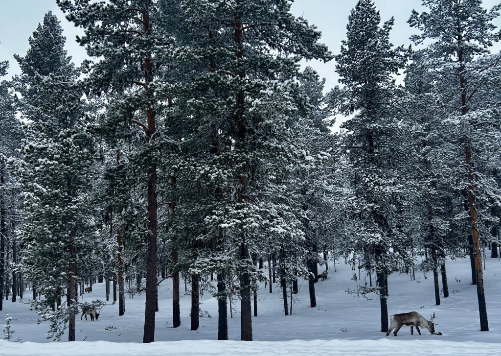 Our arctic circle home base was Jukkasjärvi, just a short drive from Kiruna, Sweden and near the Abisko national park. We loved this area – the neighborhood where we stayed was walking distance to the main sights, and also to a grocery store and some lovely nature. We took a very remote and snowy drive from Jukkasjärvi to Paksuniemi, spotting reindeer along the way.