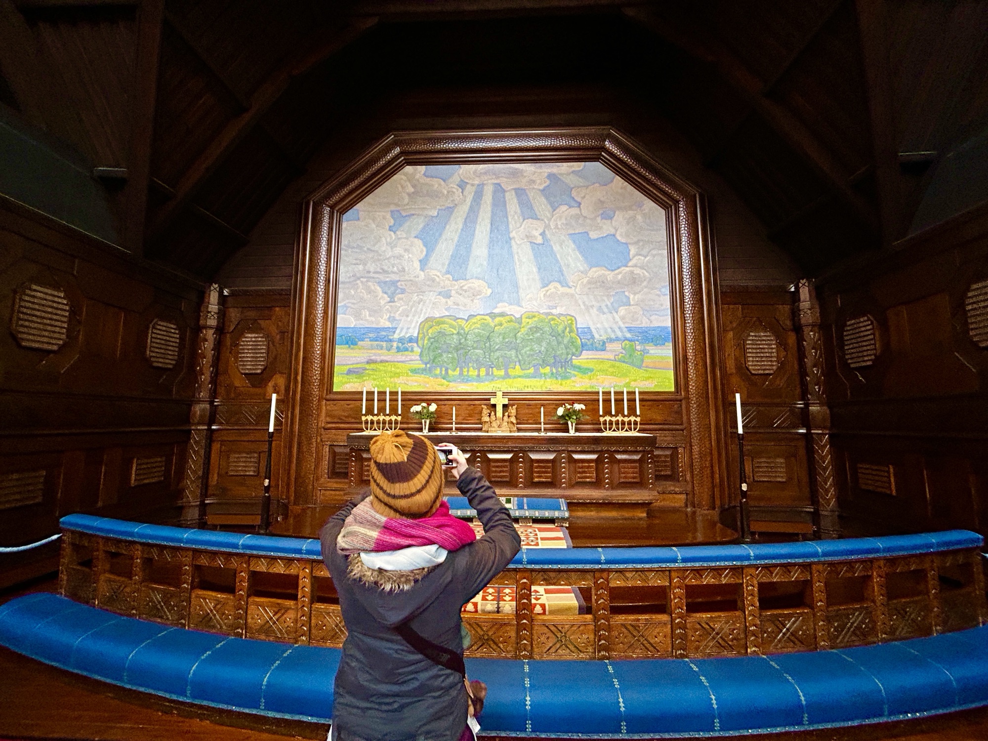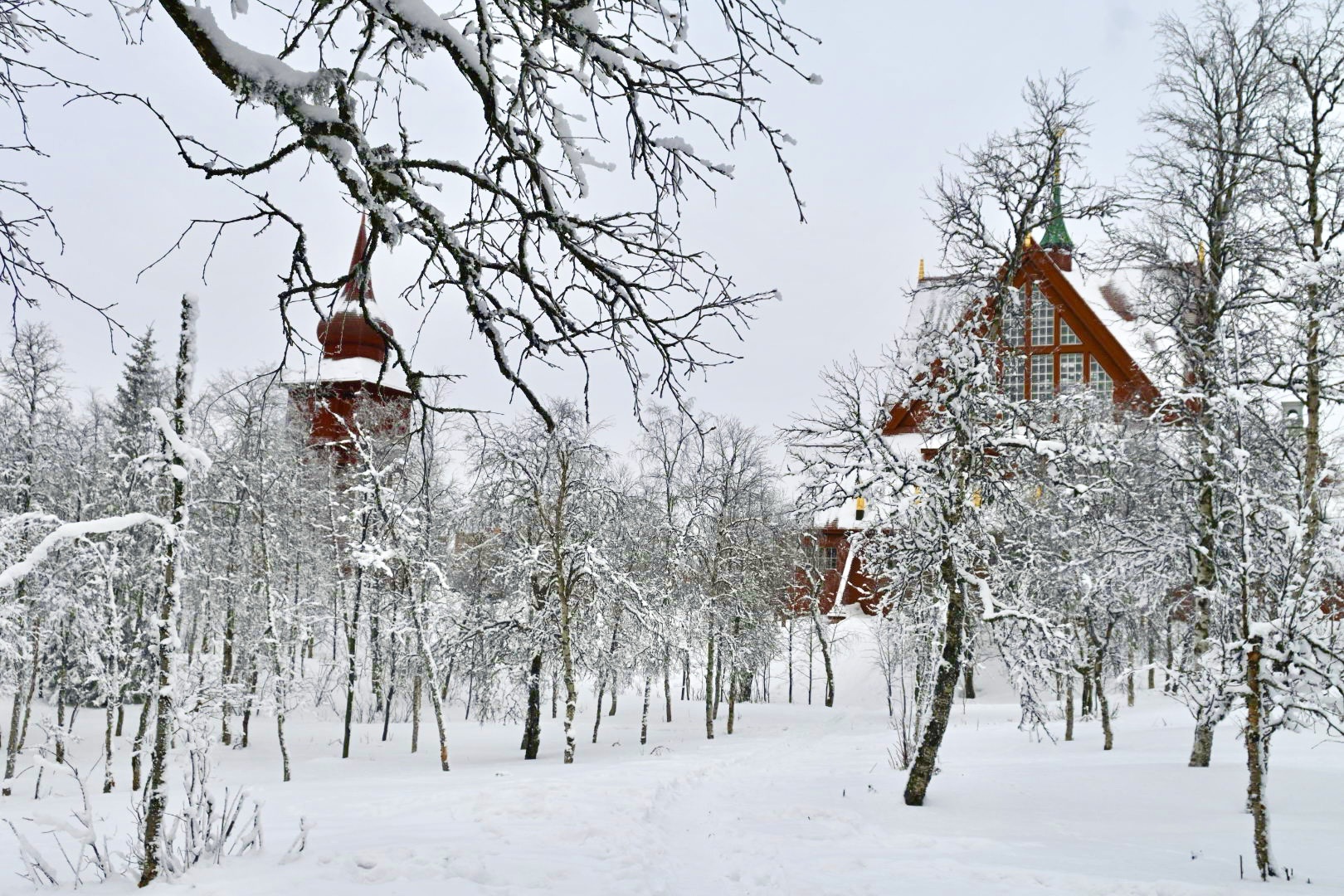 There are two lovely churches in the Kiruna area worth a visit. Jukkasjärvi Kyrka is the oldest church in Swedish Lapland, with the oldest part dating back to the early 1600s. The tall wooden clock tower were added in the mid-1700s. The triptych depicts a coming together of Christian and Sami traditions. The organ in the church is made from reindeer horn and birch and decorated with Sami cultural stories.