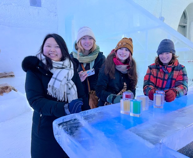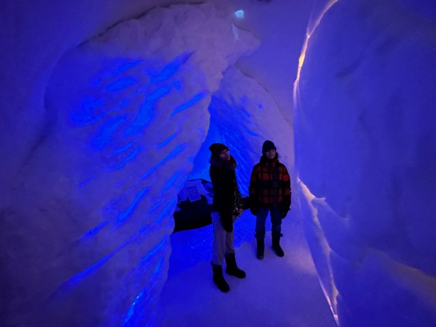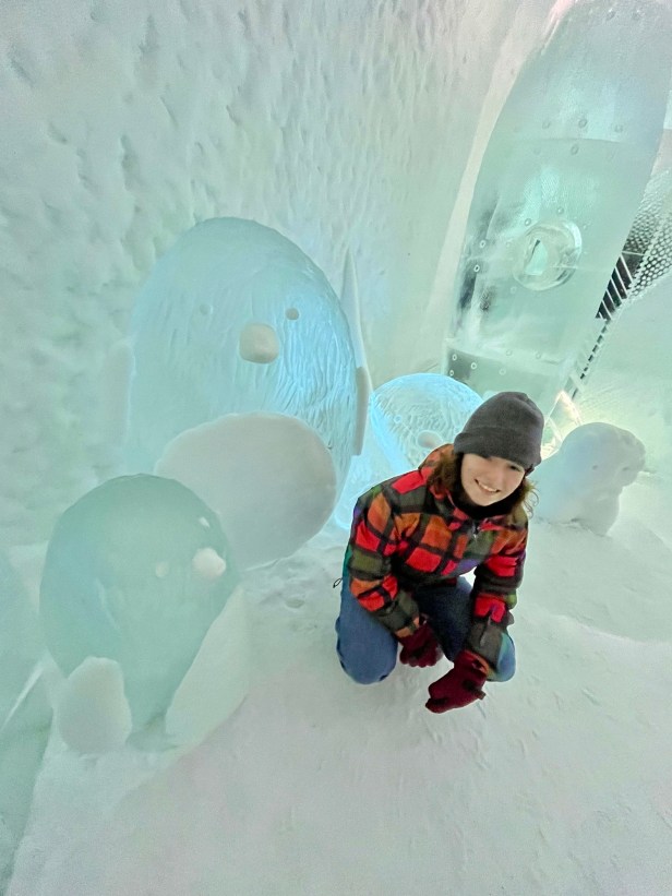 In 1989 the first ICEHOTEL was created and many people go to Jukkasjärvi during the winter to see it. To be honest, I wasn’t sure what to expect – I knew we wouldn’t be sleeping at the hotel itself (sleeping in a room made of ice on an ice slab isn’t really my thing), but what I didn’t realize is that the ICEHOTEL is really less hotel and more ice art gallery. We spent an afternoon and evening exploring all the different rooms and then trying out some frosty drinks at the ice bar. This was one of our favorite experiences, everyone loved it, and getting to see the sun set amidst this glowing art gallery was really something special.