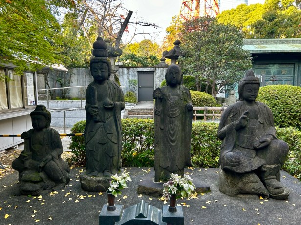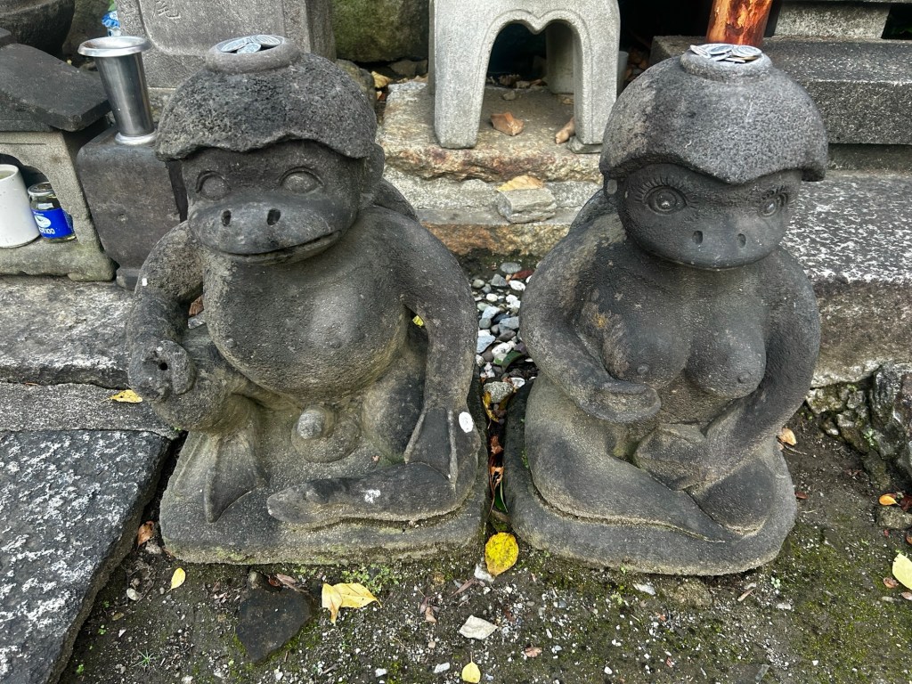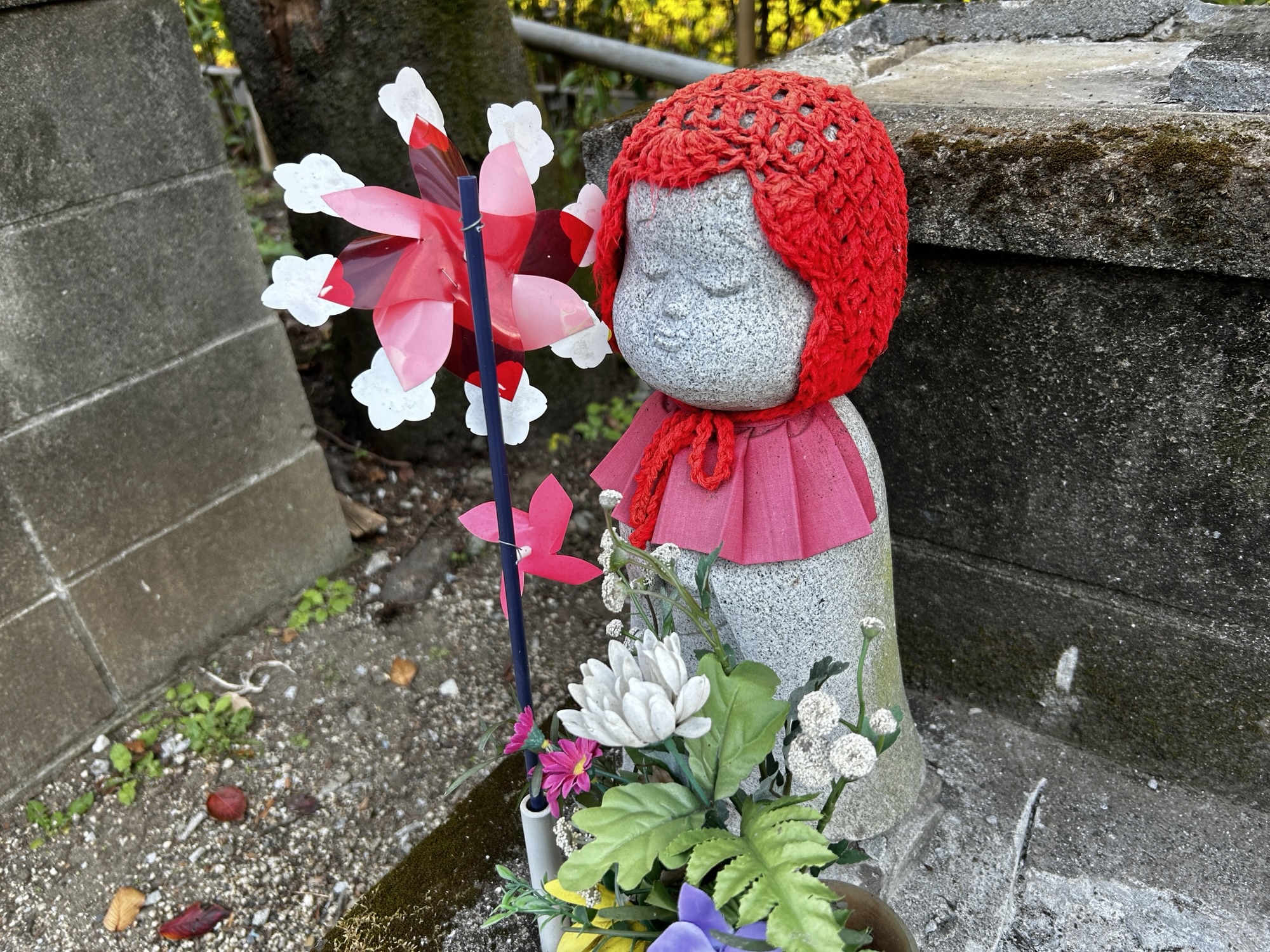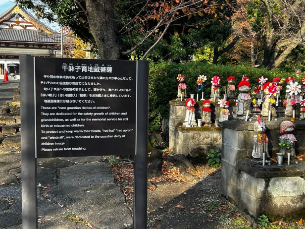 The Jizo statues here are the care deities of children, stone statues representing both the safety and care of children and also as a memorial to unborn children lost to miscarriages, abortions, or stillbirths. You can leave offerings for Jizobosatsu, the Buddhist protector of women and children. Once a month, the temple holds a memorial service called Mizuko Kuyo, and participants make red cloth pouches to hold offerings. The pouches are draped around the statue, incense is lit, and the priest chants. It was very touching to walk through here and see these little Jizo.