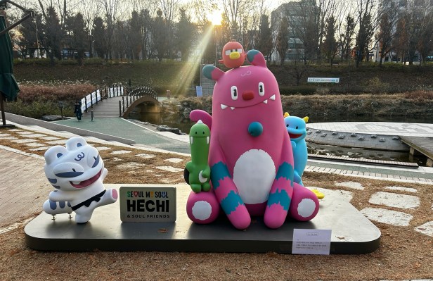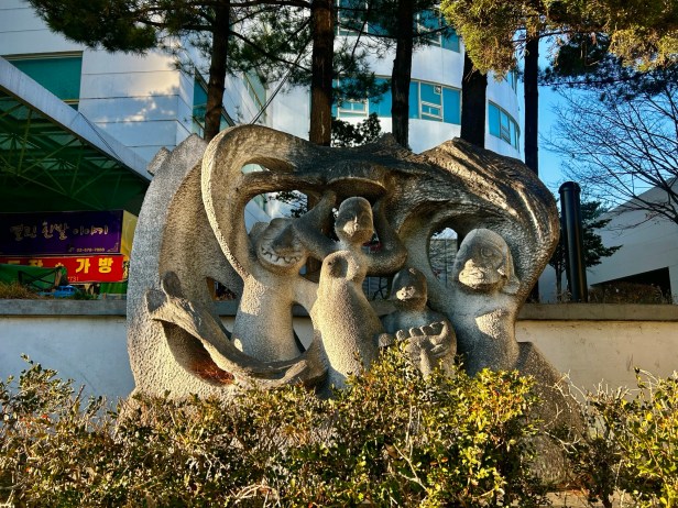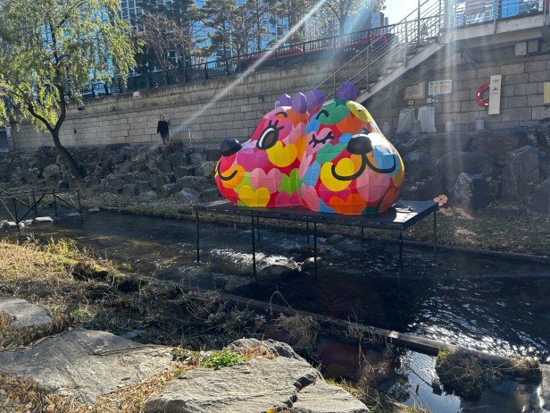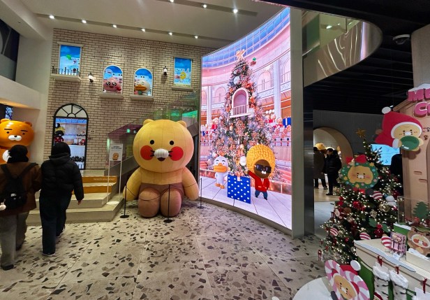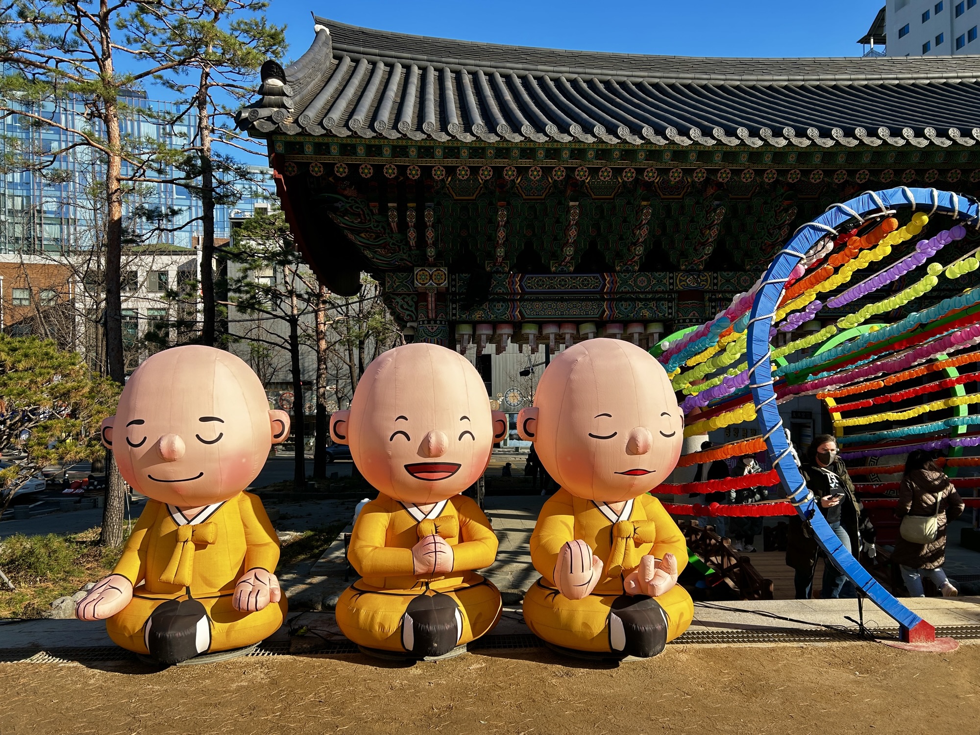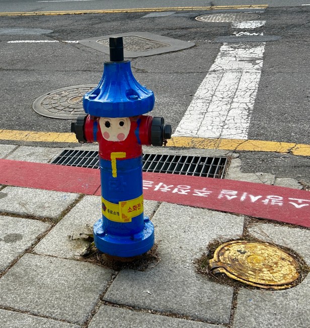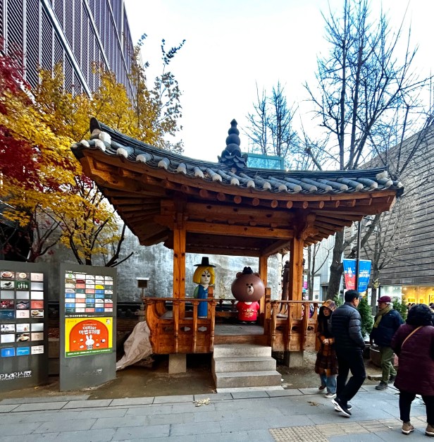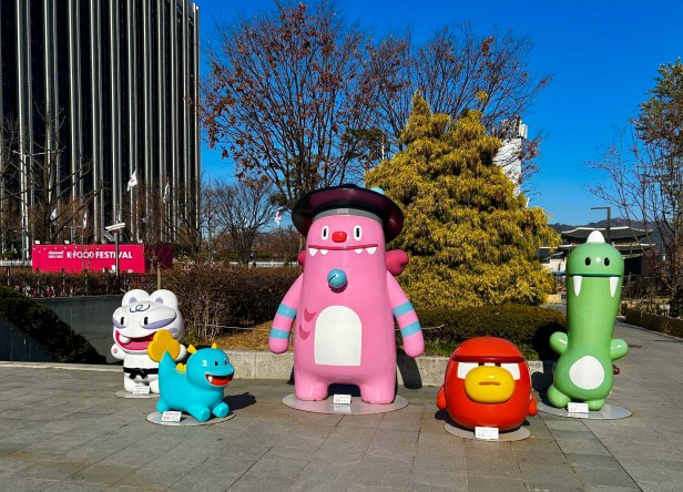 Some other fun sights – in Asia I saw a lot of Christmas trees decorated with squirrels, and Hechi (pink cartoon guy) is a well-known Korean guardian representing justice and protecting people from fire and other disasters. I saw him all over the city.
