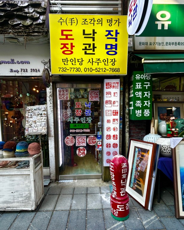 Insa-dong area houses galleries, restaurants, teahouses, and cafes. The intention is to showcase and sell traditional Korean art, handicrafts, and food. The teahouses and restaurants can be found in twisting alleyways, and on weekends the main street is blocked off, booths are set up, and candy merchants, fortune tellers, performances and exhibits take place. I loved seeing the handmade stamps and had one made for my daughter.